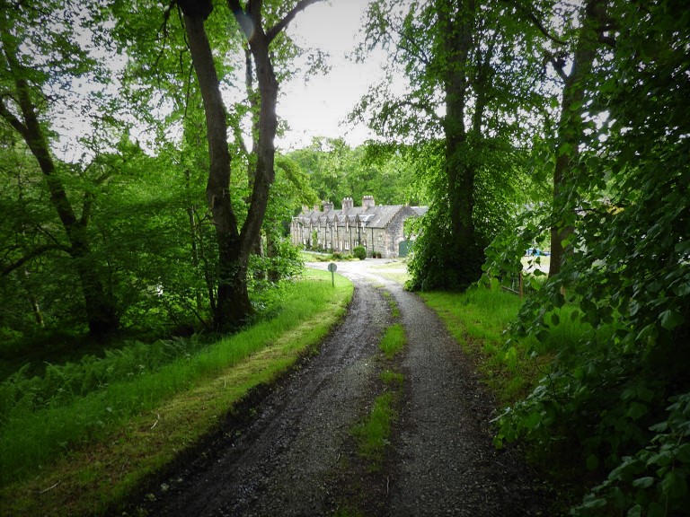 We arrived at Erchless Estate on a Saturday afternoon. The winding, narrow country roads were mostly impassable for two vehicles, so there were periodic “passing places” where one car could move off the road and allow the oncoming traffic to pass. I was thoroughly charmed by the low, moss-covered stone walls running right alongside the road bordering the estate. As we drove through the entrance, a row of attached old, stone cottages appeared.