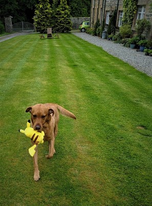 Flynn, a friendly red dog, was the first to greet us, offering a game of fetch with a stuffed Pikachu as a gesture of friendly Scottish hospitality. He was soon joined by his people, Allison and Greg, caretakers of the property, who also extended a warm greeting – minus the offer of a game of fetch!