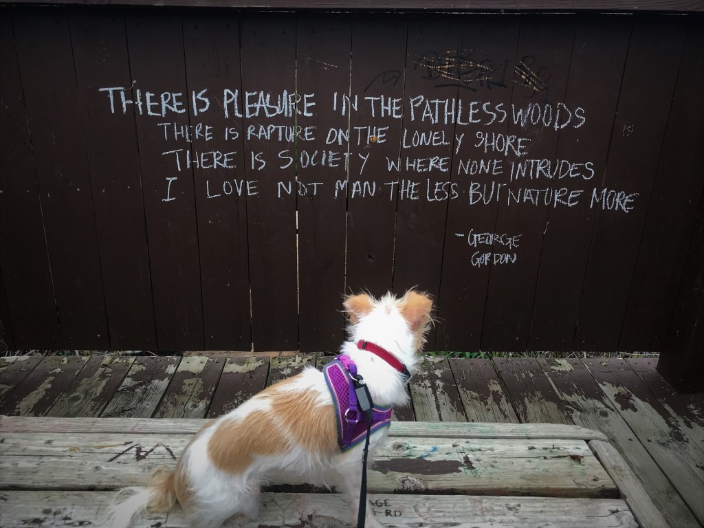This is an inland preserve with trails though a diverse wetlands and woodsy area – perfect for finding all sorts of wildlife. Pip enjoyed this one though the floating bridges made her a bit nervous. We saw birds, turtles and water lilies and found this to be a very peaceful place. The trails here were flat and fairly short. The preserve does connect to Hofma Park for more trail options. It was here, at Hofma Preserve, that I took the signature photo for my Trips with Pip series. This was my favorite trail of the trip.